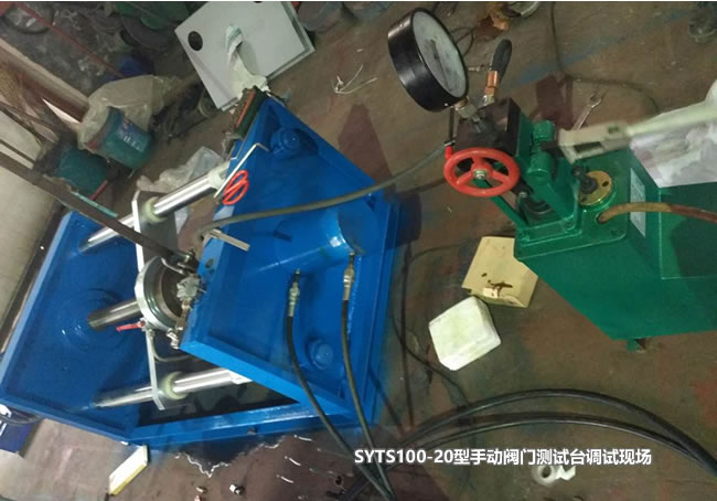 SYTS100-20型手动阀门测试台调试现场 SYTS100-20型手动阀门测试台主要技术参数 被测阀门公称通径DN: 20-250毫米直通式法兰连接阀门。 测试压力Pc:不大于32MPa 液 压 用 油 :N46号液压油 油        温:15℃---60℃ 试验介质:水(允许加防锈剂)、煤油或粘度不大于水的 试验温度(环境温度):5℃~40℃ 夹持距离:750mm 夹持力:30(T) 夹紧油缸的压力值不得超过20MPa。 SYTS100-20型手动阀门测试台操作方法 (一)SYTS100-20型手动阀门测试台操作前准备工作: 1、管路连接: ①将手动油泵油管连接到设备油缸相应接口上。 ②手动试压泵水管连接到设备相应的接口上。 ③水源接口与水龙头连接。 2、注液: ①将手动油泵油箱注满油; ②手动试压泵水箱注满水。 (二)夹紧阀门: 1、将密封盘装在设备上。转动夹紧手轮将空档调至适当宽度。吊被测阀门至设备空档位置,旋转夹紧手轮夹紧阀门不致掉落。 2、手动力作用在手动油泵压杆上,带动油泵柱塞作往复运动,使油缸达到相应压力(见压力对照表)停止作用即可。(手动油泵具体操作请参见手动油泵说明书) (三)SYTS100-20型手动阀门测试台阀门压力测试: 1、关闭手动试压泵放水阀,打开控制阀针,然后压动操作手柄上下运动,使柱塞作往复运动,用力要均匀避免冲击。观察压力表,使其达到测试压力。拧紧控制阀手轮,关闭控制阀针,使被测阀门与泵隔绝,在规定时间内压力表读数符合要求即可。(手动试压泵具体操作请参见手动试压泵说明书) 2、试压完毕后,应先松开控制阀针,后松开放水阀针。注:松开手轮时,应缓慢均匀,避免突然打开使压力表受冲击而损坏。(手动试压泵具体操作请参见手动试压泵说明书) (四)阀门的拆卸: 搬动手动油泵换向阀至中位档,泄掉压力,反方向旋转夹紧手轮,松开并取下阀门,搬动手动油泵换向阀至退回档,手动力作用在手动油泵压杆上,带动油泵柱塞往复运动,使油缸退回。(手动油泵具体操作请参见手动油泵说明书)